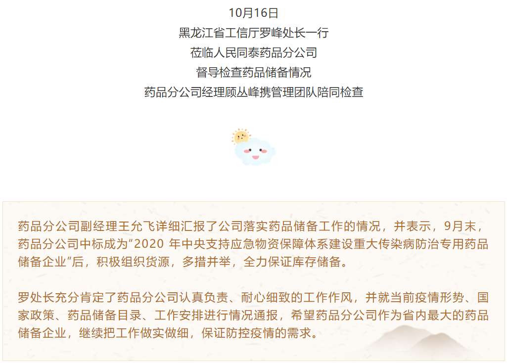 黑龙江省工信厅领导莅临药品分公司督导检查药品储备情况